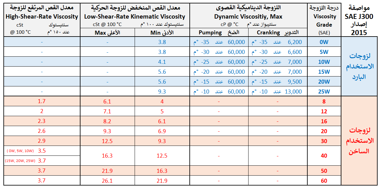 الجدول أدناه يبين الفرق بين مستويات اللزوجة حسب مواصفة SAE J300 (اسم مواصفة منظمة الـSAE لدرجات لزوجة زيوت محركات السيارات)